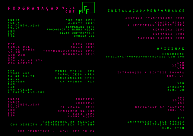 Começa hoje o Festival Fora de Forma organizado pelo coletivo Wake Up Colab. Serão três dias de apresentações eletrônicas, perfomances e oficinas. Abaixo o flyer com o nome das apresentações. Descubra por conta própria onde acontecerá...